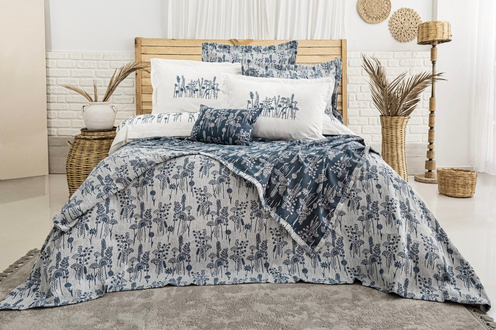 Te presentamos un juego de cama de un tono profundo entre el azul y el violeta, un diseño tropical que dará realce a tu dormitorio.